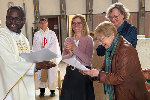 Pater Joseph überreicht Ursula Wiesinger eine Dank-Urkunde. [...]