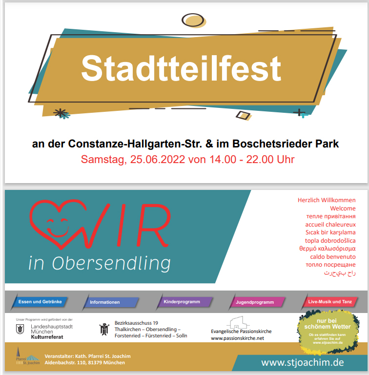 Die Pfarrei St. Joachim und die Passionskirche laden ein – gemeinsam mit dem Bezirksausschuss 19 und der Stadt München – zu einem Fest der Begegnung und Vernetzung, zu Information und Gespräch, Spieß und Spaß. Neben einem bunten Bühnenprogramm mit Live-Musik und Tanz gibt es vielfältige Angebote für Kinder und Jugendliche. Verschiedene Organisationen und soziale Einrichtungen unseres Stadtteils präsentieren sich an Infoständen. Mit einer interreligiösen Andacht setzen wir einen spirituellen Impuls. Und auch für das leibliche Wohl ist gesorgt. Wir freuen uns auf Euch!